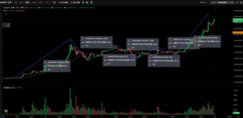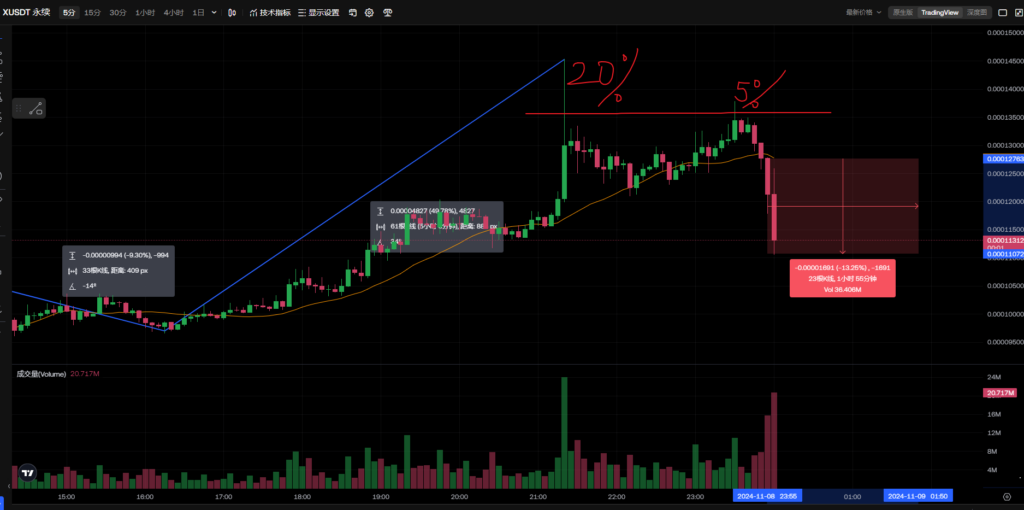 23:30 五分钟再次拉升5%,形成五分钟的双顶,而后出现下杀,30分钟跌幅20%