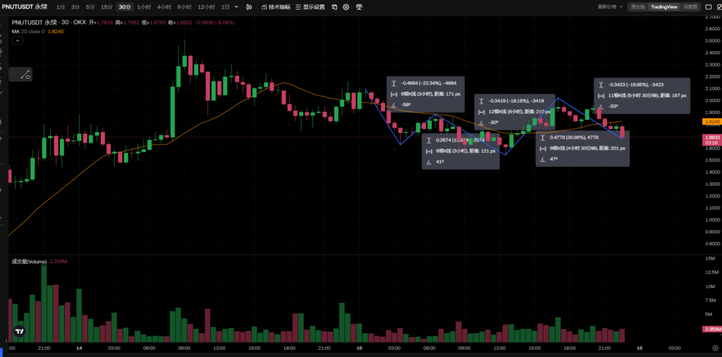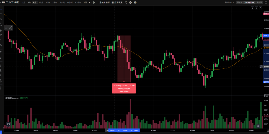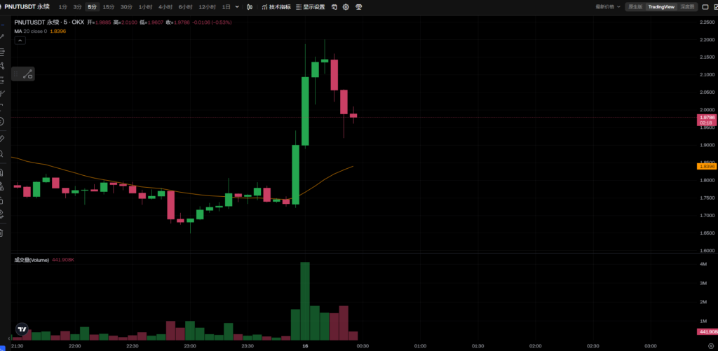 PNUT今天前期剧烈震荡向下,后期,剧烈震荡向上,尾盘又出现急速拉升。短周期策略,一定要遵守,不然会死的很惨,杠杆不要超过5倍,今天已经爆仓一次,虽然后面做回来了,还盈利了但真的及其危险。
