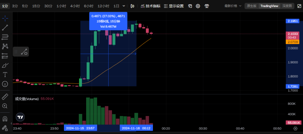 尾盘一分钟走势图,15分钟拉升27%,及其恐怖,一定多注意尾盘,尤其是这种波动最强币种,可以在早盘和尾盘切换一分钟策略,可以在一分钟收阴线平仓。