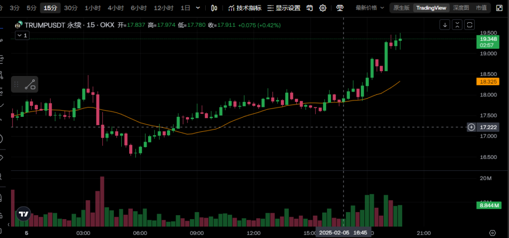TRUMP、VINE明星币种2025-02-05 2025年2月5日 作者 想飞の猫 TRUMP,在下午16点开始发动上涨,半小时回调后在16:45再次上攻,螺旋式上涨。 VINE,在08:00开始发动上涨,14:00达到短期高点,持续时间6小时,而后螺旋式上涨。